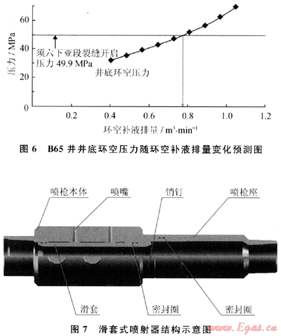 如圖6所示,在設(shè)計(jì)865井須六上亞段水力噴射壓裂時(shí),當(dāng)環(huán)空補(bǔ)液排量達(dá)到0.7m3/min,井底環(huán)空壓力就超過已經(jīng)壓裂的須六下亞段的裂縫開啟壓力,因此須六上亞段的環(huán)空補(bǔ)液排量的上限就是0.7m3/min。