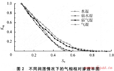 圖2給出了不同潤濕條件下的氣相相對滲透率曲線。在每一飽和度下,水濕巖樣的氣相相對滲透率總比氣濕巖樣的氣相相對滲透率低很多,這給出了一個可在油田應(yīng)用的潛在方法:對致密氣藏,改變近井地帶的潤濕性,使其由水濕變?yōu)闅鉂?,可以增加氣體的滲流能力,提高產(chǎn)量或注入量。值得注意的是,當(dāng)水飽和度大于0.4時,氣體的相對滲透率按照水濕→弱水濕→弱氣濕→氣濕的順序依次增加;但當(dāng)水飽和度小于0.4時,相對滲透率增加的次序性被打亂,在弱水濕情況下表現(xiàn)為最小。