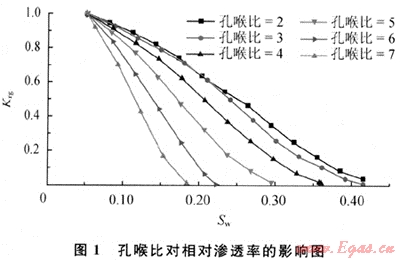 在孔隙結(jié)構(gòu)中,平均喉道半徑對滲透率的影響最大,這方面已經(jīng)有許多研究成果。這里主要討論孔喉比(孔隙半徑和與之連通的喉道半徑之比)對滲透率的影響。在模型中,保持其他條件不變,使孔喉比在2~7間變化,計算得到的氣相相對滲透率(Krg)與含水飽和度(Sw)的關(guān)系如圖1所示。