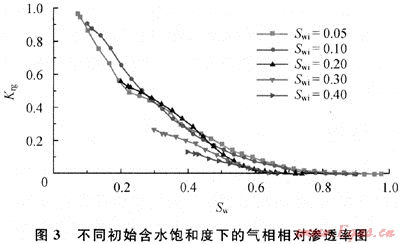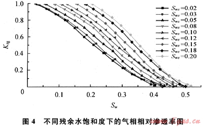 由圖4可見,殘余水飽和度對氣相相對滲透率有著明顯的影響,殘余水飽和度越大,氣相相對滲透率曲線越陡,下降越快。
