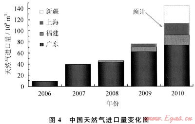 進口液化天然氣(LNG)正在幫助緩解因需求迅速上升給國內(nèi)市場供應(yīng)帶來的壓力。自2006年5月26日國內(nèi)第一船進口6×104t澳大利亞液化天然氣運抵深圳大鵬灣以來,國內(nèi)進口液化天然氣設(shè)施已發(fā)展到3座,分布在廣東深圳、福建莆田和上海洋山,規(guī)模分別為370×104t/a、260×104t/a和300×104t/a。2009年液化天然氣進口量已由2006年的69×104t猛增到553×104t(76×108m3)(圖4)。進口液化天然氣以用作發(fā)電和工業(yè)燃料為主,也有一部分進入城市天然氣管道,滿足民用燃氣需求。隨著上海洋山進口設(shè)施轉(zhuǎn)入正常運轉(zhuǎn),并保障上海世博會期間的燃氣供應(yīng),中海油3座進口設(shè)施2010年的進口量可能會輕易超過800×104t。今后兩三年內(nèi),當中石油江蘇如東和遼寧大連以及中海油浙江寧波共3座在建進口設(shè)施建成投產(chǎn)時,液化天然氣年進口規(guī)模將由現(xiàn)在的930×104t擴大到1880×104t。中海油預(yù)計到2020年僅該公司就將擁有5000×104t/a進口液化天然氣接收能力。