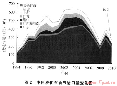 珠江三角洲和長江三角洲是進口液化氣的消費中心(圖2)。廣東省是國內(nèi)最大的進口液化氣市場。在過去5年里,廣東省進口量一直占全國的70%左右。不過,價格高漲和經(jīng)濟滑坡引起的需求下降導致廣東省進口量從最高時2005年的447×104t降低到2009年的178×104t。在這幾年里,國內(nèi)第一座年進口370×104t液化天然氣(LNG)設(shè)施2006年5月在深圳建成投產(chǎn)以及比鄰的海南省800×104t/a新建煉油廠同年6月投產(chǎn)也給廣東省進口液化氣市場帶來沖擊。不過,外向型的經(jīng)濟特征和分布廣泛的加工企業(yè)決定了廣東省對優(yōu)質(zhì)進口液化氣的堅實需求。2009年廣東省進口量上升到296×104t,將近2/3的升幅明顯高于全國平均水平。