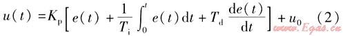 由于計(jì)算機(jī)控制是采取采樣方式控制的,它只能根據(jù)采樣時刻的誤差值計(jì)算控制變量(調(diào)整量)u,因此,必須對傳統(tǒng)算法進(jìn)行修正才能用計(jì)算機(jī)軟件來實(shí)現(xiàn)適用于計(jì)算機(jī)的控制算法[4~7]。時間t可采用下式給出:
