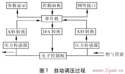 操作者通過控制中心遠(yuǎn)程或控制面板現(xiàn)場設(shè)定出口壓力值。在現(xiàn)場站點(diǎn)的入口和出口處均設(shè)有壓力傳感器,實(shí)時將入口、出口側(cè)的壓力信號經(jīng)模擬/數(shù)字信號(A/D)轉(zhuǎn)換器輸入單片機(jī),并可在液晶屏幕上實(shí)時顯示。當(dāng)出口壓力低于設(shè)定值時,單片機(jī)發(fā)出的數(shù)字控制信號經(jīng)數(shù)字/模擬信號(D/A)轉(zhuǎn)換器轉(zhuǎn)換后輸出模擬電流信號至燃?xì)夥辣娮涌刂崎y,電子控制閥流量增大直至出口壓力達(dá)到設(shè)定值。當(dāng)出口壓力高于設(shè)定值時,單片機(jī)發(fā)出控制信號經(jīng)數(shù)字/模擬信號(D/A)轉(zhuǎn)換器轉(zhuǎn)換后輸出模擬電流信號至燃?xì)夥辣娮涌刂崎y,電子控制閥流量減小直至出口壓力達(dá)到設(shè)定值。當(dāng)入口壓力過低或者過高、超出警戒值時,系統(tǒng)可以在現(xiàn)場顯示報警,也可以通過網(wǎng)絡(luò)接口上報控制中心。系統(tǒng)可選用512 kb儲存器作為人機(jī)交互系統(tǒng)的外部儲存器,用來儲存設(shè)置參數(shù)等信息,這樣可以將壓力數(shù)據(jù)儲存并按要求進(jìn)行統(tǒng)計(jì)以供顯示或上傳調(diào)用。