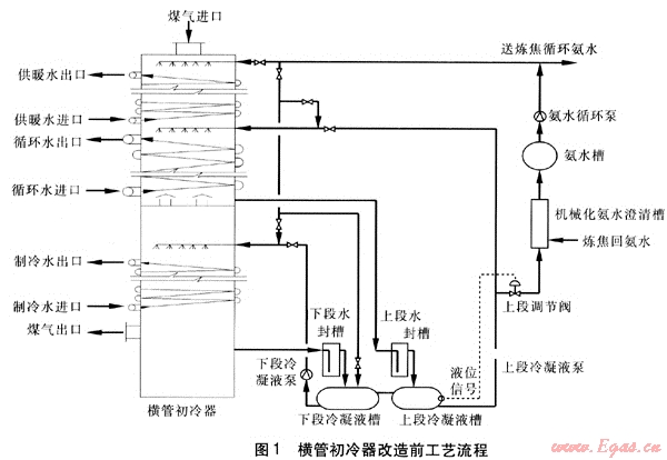5臺(tái)橫管初冷器并聯(lián)操作,煤氣從橫管初冷器上部進(jìn)入,為了保證初冷器對(duì)煤氣的冷卻效果,用水對(duì)煤氣分3段進(jìn)行冷卻。上段冬季進(jìn)水水溫為47℃,出水水溫為60℃,為合理利用熱量,將出水為附近居民供暖,回水再去上段冷卻煤氣,故該廠稱此水為供暖水。其余時(shí)間上段同中段一樣,用進(jìn)水水溫為32℃、出水水溫為45℃的循環(huán)水對(duì)煤氣進(jìn)行冷卻。下段用16℃制冷水將煤氣冷卻至18~22℃。為保證初冷器的冷卻除萘效果,在中、下段頂部連續(xù)噴灑焦油、氨水混合液,在上段頂部用熱氨水循環(huán)噴灑,以清除管壁上的焦油、萘等雜質(zhì)。初冷器上、中段排出的冷凝液經(jīng)水封槽流入上段冷凝液槽,用泵將其送入初冷器中段頂部循環(huán)噴灑,下段冷凝液槽內(nèi)多余的部分送到機(jī)械化氨水澄清槽。初冷器下段排出的冷凝液經(jīng)水封槽流入下段冷凝液槽,用泵將其送入初冷器下段頂部循環(huán)噴灑,下段冷凝液槽內(nèi)多余部分流入上段冷凝液槽。橫管初冷器改造前工藝流程見圖1。
