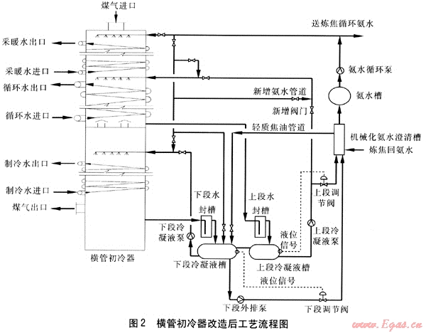 ⑤ 在下段冷凝液槽增設(shè)50m3/h的外排泵1臺(tái),將下段冷凝液抽到機(jī)械化氨水澄清槽,依靠泵出口調(diào)節(jié)閥自動(dòng)控制下段冷凝液槽液位在1.5~1.7m。由于下段冷凝液槽液位的降低,下段水封槽液面與下段冷凝液槽液面形成1.5m的高度差,5臺(tái)下段水封槽流下的大約550m3/h的冷凝液在進(jìn)入下段冷凝液槽時(shí),會(huì)使下段冷凝液槽內(nèi)部冷凝液充分?jǐn)噭?dòng),可防止槽內(nèi)積萘。將下段冷凝液槽外壁進(jìn)行了保溫處理,防止冬季槽壁積萘。在冬季可以將循環(huán)氨水用管道從下段冷凝液槽上部大量加入其中,以提高下段冷凝液的溫度,逐漸溶化槽內(nèi)的積萘,將溶化的沉渣及時(shí)排至機(jī)械化氨水澄清槽。橫管初冷器改造后工藝流程見圖2。