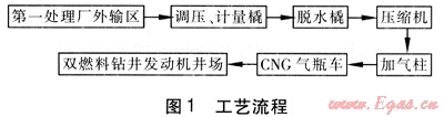 結(jié)合蘇里格氣田現(xiàn)狀,氣源來自蘇里格氣田第一天然氣處理廠,原料氣壓力為4.5~5.2MPa,溫度為0~20℃,經(jīng)調(diào)壓、計(jì)量、深度脫水后壓縮至20MPa,用CNG氣瓶車運(yùn)輸至井場(chǎng),在井場(chǎng)調(diào)壓后供雙燃料機(jī)組使用。根據(jù)工藝要求,需要的設(shè)備主要有調(diào)壓計(jì)量裝置、脫水裝置、壓縮機(jī)、加氣柱、CNG氣瓶車、雙燃料鉆井發(fā)動(dòng)機(jī)機(jī)組前調(diào)壓計(jì)量裝置。工藝流程見圖1。