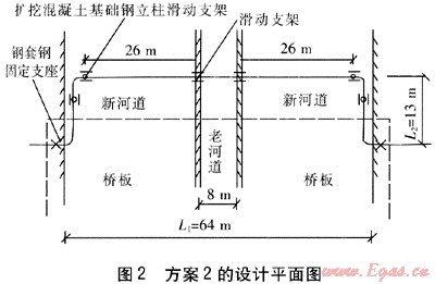 方案2為擴挖混凝土基礎鋼立柱架空跨越設計方案,設計平面圖見圖2。利用老河道的河墻作為兩處滑動支架的支撐,在河道內新增4個擴挖混凝土基礎鋼立柱滑動支架,跨河管道采用自然補償方式。