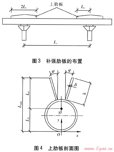 該方法通過增大管道截面系數(shù),使滑動支架跨距增加30%~60%[4],而多消耗的金屬不會超過管子重量的10%。當滑動支架間距較長時,可以在滑動支架處管道上方加焊肋板,肋板可用扁鋼或鋼板制成,補強肋板的布置見圖3。圖中,Ls為兩個滑動支架之間的距離,單位為m;Lr為滑動支架支點距肋板最遠端的距離,單位為m,取Lr=0.1Ls。上肋板剖面圖見圖4,圖中,φ為肋板與管子截面中心垂直線的夾角,單位為(°);δ為肋板厚度,單位為m;h為肋板高度,單位為m;點S為管道補強后的重心,點O為坐標原點;L3為點S、O間距離,單位為m;L4為點S距肋板上端的垂直距離,單位為m;Lsum為L3、L4之和,單位為m。圖4中兩側肋板軸線交于點S。