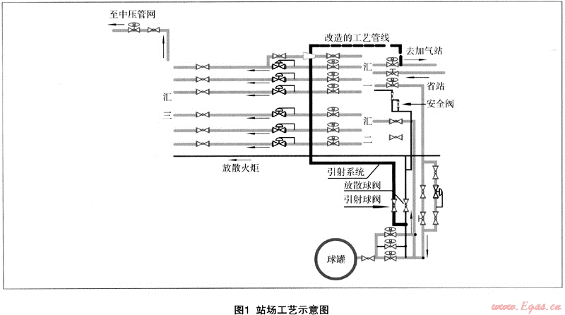 把站場引射器下方管線和加氣站進(jìn)氣管道連接起來,關(guān)閉匯一集氣罐上到加氣站去的球閥。這樣就用球罐存氣通過引射管道供光明村加氣站運(yùn)行,球罐晚間進(jìn)氣到高壓0.92MPa,白天通過引射管線供加氣站。見圖1。