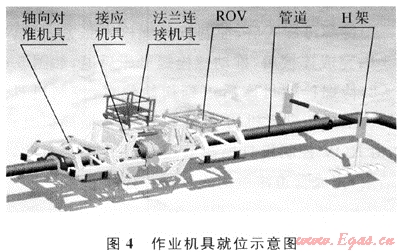 2) ROV攜帶輔助機具就位到工作地點后,軸向?qū)?zhǔn)機具和接應(yīng)機具將管道粗對準(zhǔn)。