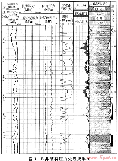 對測井資料預(yù)測的破裂壓力與實際施工的參數(shù)進行了對比,發(fā)現(xiàn)兩者有較好的一致性。LGX井酸壓井段6055~6124m,其酸壓施工的實際破裂壓力值為127.4MPa,而計算的破裂壓力值為122.1MPa,誤差為4%。LGY井酸壓井段5953.00~5990.00m,破裂壓力測量值為128.6MPa,而計算的破裂壓力值為122.4MPa,誤差為2%。LGZ井飛仙關(guān)組射孔井段4781.00~4812.00m,該段地層破裂壓力測量值為97MPa,計算值為100MPa,誤差為2%。