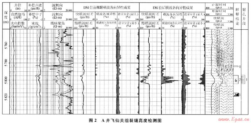 圖1是LG地區(qū)A井裂縫高度預(yù)測圖,可以看出:當壓力增量為1MPa時,形成高度為8m的壓裂縫,壓裂縫延伸井段為5794~5804m;當壓力增量超過1.0MPa時,壓裂縫繼續(xù)略有延伸。用A井套前、套后交叉偶極橫波測井資料檢測[5]了其裂縫高度(圖2),可以看出:壓裂前,5794~5804m各向異性不明顯,壓裂后,該井段呈現(xiàn)一定的各向異性,由此判斷壓裂縫井段為5794~5 804m,縫高為8m,表明該井實際的水力壓裂裂縫井段為5794~5804m,與預(yù)測結(jié)果一致。