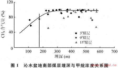 一般取甲烷濃度80%為風氧化帶的底界。用不同埋深或不同煤層上覆有效厚度的鉆孔、煤層氣井或煤礦抽放出得煤層氣進行氣體組分分析,得出風氧化帶的深度。如沁水盆地南部煤層氣藏甲烷組分含量隨煤層埋藏深度的加大而增加,甲烷組分含量大于80%對應的煤層埋深為180m,即可確定風氧化帶的深度為180m左右(圖1)。