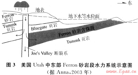 開放性斷層邊界有兩種情形:位于地下水補給區(qū)的開放性斷層和位于地下水排泄區(qū)的開放性斷層。地下水沿位于補給區(qū)的開放性斷層帶補給,分別向斷層兩側的煤層與含水層運移,對煤層氣的散失起到阻止作用,同時斷層兩側的含水層和煤層為不同的流體流動單元。因此起到分割不同煤層氣藏的作用。這類斷層邊界有利于煤層氣的保存。而地下水沿位于排泄區(qū)的開放性斷層排泄,造成煤層氣的散失。典型實例見圖3[4]。
