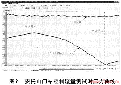 從圖7可見,在測試時段,流量基本可控制在控制線以下,當(dāng)停止測試時,不進行持續(xù)降壓,管道儲氣將不再被利用,流量將很快回升到用戶需求量。從圖8可見,壓力由1.4MPa降到1.275MPa,變化平穩(wěn)。