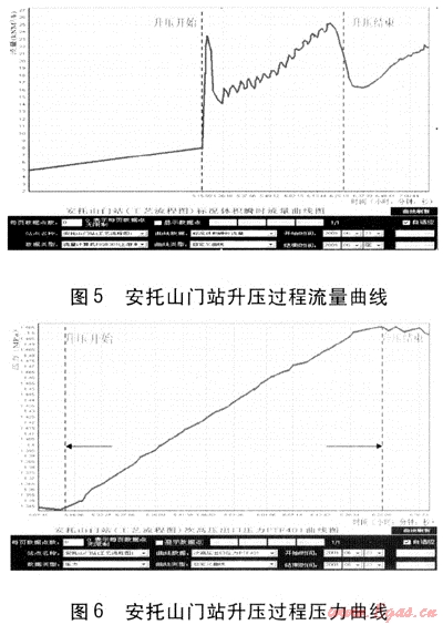在調(diào)壓方面的應(yīng)用主要是通過手動控制或出口調(diào)壓方式來實現(xiàn)升、降壓。在初期建議采用手動控制方式進行,通過摸索,尋找合適的壓力步長、靜止時間,再采用出口調(diào)壓方式。在升壓過程中如果設(shè)置步長過大、靜止時間過短,則流量上升速率過大,造成進口壓力下降太快,可能造成上游過流閥切斷;在降壓時則造成調(diào)壓器閥口開度過小,流量下降速率過大,造成進口壓力過高,甚至達到上游緊急切斷閥切斷壓力值。如果步長過小、靜止時間過長,則達到目標(biāo)壓力所需的時間過長。通過摸索,壓力步長為10~20kPa、靜止時間在10min左右,壓力、流量的變化較為平穩(wěn)。不同時段下游用氣量不同,壓力步長及靜止時間的設(shè)置也不盡相同。廠站人員在剛開始調(diào)壓時通常采用手動方式,實施數(shù)次后,觀察流量及上下游壓力變化,選擇出合理的壓力步長及靜止時間。圖5、6為改造后安托山門站將壓力由1.341MPa升至1.51MPa的流量、壓力曲線。