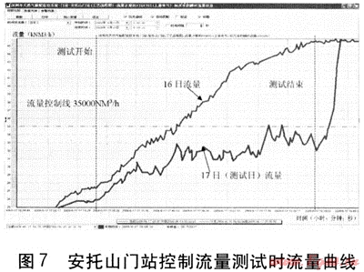 目前兩座門站沒有設(shè)置限流裝置,上游也沒有對門站采取限流。當(dāng)出站壓力保證穩(wěn)定,不采取降壓以利用次高壓管道的管道儲氣的情況下,在用氣高峰時段,流量超過合同規(guī)定的最大提取速率,超過最大提取速率提取的氣量將按正常價格的150%計價。針對以上實際情況,將壓力遙調(diào)的功能進行拓展,通過在高峰時段降低出口壓力,減小調(diào)壓器開度,從而間接地降低流量。在高峰時段需頻繁降壓,將流量控制在上游要求的最大提氣速率的95%以內(nèi),用戶需求的不足部分通過降低管道壓力、利用管道儲氣來補充。低峰時升高壓力來補充管道儲氣。這種頻繁的調(diào)整,在沒有遙調(diào)系統(tǒng)的情況下是很難實現(xiàn)的。圖7、8為改造后安托山門站晚高峰控制流量測試時的流量、壓力曲線。