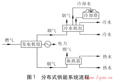 分布式供能系統(tǒng)通常由發(fā)電機組、溴化鋰吸收式冷水機組和換熱設備組成。這里研究的分布式供能系統(tǒng)以天然氣為主要燃料,在用戶側(cè)安裝燃氣輪機或燃氣發(fā)動機發(fā)電機組,利用燃料高品位能量進行發(fā)電,產(chǎn)生的電力滿足用戶的電力需求,并通過余熱回收利用設備回收發(fā)電產(chǎn)生的煙氣熱量,向用戶供冷、供熱。分布式供能系統(tǒng)流程見圖1。