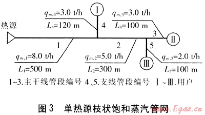 某單熱源枝狀飽和蒸汽管網(wǎng)(見圖3),管段1~5局部阻力當量長度分別為:管段1:1個截止閥、7個方形補償器,局部阻力當量長度為166.8m;管段2:1個直流三通、5個方形補償器、1個異徑接頭,局部阻力當量長度為84.8m;管段3:1個直流三通、2個方形補償器、1個異徑接頭、1個截止閥,局部阻力當量長度為46.3m;管段4:1個截止閥、1個分流三通、2個方形補償器,局部阻力當量長度為37.6m;管段5:管件、閥門設(shè)置與管段4相同,局部阻力當量長度為37.6m。熱源、用戶Ⅰ~Ⅲ的壓力分別為1.0、0.7、0.7、0.7MPa。