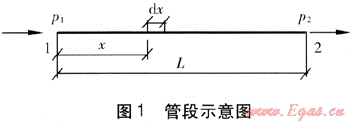 取長度為L的蒸汽管段為研究對象(見圖1),設(shè)管段起始節(jié)點為1,對應(yīng)壓力為p1;末端節(jié)點為2,對應(yīng)壓力為p2。