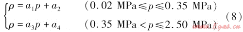 對于飽和蒸汽的熱力性質(zhì),國際水和蒸汽性質(zhì)協(xié)會(IAPWS)在1997年建議開始使用新的水和蒸汽熱力性質(zhì)的IAPWS工業(yè)公式(簡稱為IAPWSIF97)[3],該公式是為了滿足動力工業(yè)的需要而制定的,參數(shù)適用范圍大,表達式復(fù)雜。而常用供熱系統(tǒng)所用蒸汽壓力比動力系統(tǒng)低得多,范圍也小得多,因此在供熱系統(tǒng)常用壓力范圍內(nèi)對狀態(tài)參數(shù)進行擬合??紤]到工程應(yīng)用中以采用相對壓力為主,這里對相對壓力范圍0.02~2.50MPa的飽和蒸汽進行擬合,得到密度與相對壓力的關(guān)系式: