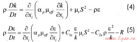 除上述基本控制方程外,還引入適合處理低雷諾數(shù)和近壁流動的RNG模型方程:
