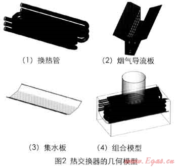 熱交換器的幾何模型如圖2。利用Gambit創(chuàng)建三維物理模型并劃分網(wǎng)格。排煙管的對稱結構相對簡單,其中的氣流變化較緩慢,網(wǎng)格參數(shù)的間距尺寸取為0.005mm;其余部分的網(wǎng)格參數(shù)的間距尺寸城小為0.002mm??偣布s劃分7917萬個網(wǎng)格。