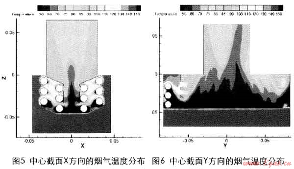 兩個垂直的中心截面沿X方向和Y方向的煙氣溫度分布如圖5和圖6。從圖中可以看出,由于煙氣流過下部換熱管的流速較小,所以換熱量較大,管后的溫度也較低。煙氣通過左右對稱的四排管子傳遞熱量,完成傳熱過程。排煙管出口的煙氣溫度比較均勻。計算得到排煙平均溫度為76.4℃,出水溫度為21.33℃,換熱管的傳熱計算總面積為0.088m2,總傳熱量為1213W,綜合傳熱系數(shù)較高:K=137W/m2.℃。