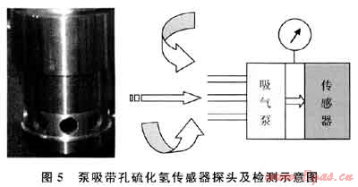 研究認(rèn)為,最好選擇膜片四周都有透氣膜或透氣孔的傳感器,這樣即使在無風(fēng)的情況下周邊的硫化氫也容易進(jìn)入測量探頭,有風(fēng)的時候效果更好。這種多向測量的改進(jìn),很好地保證了測量的及時性,傳感器內(nèi)部再加上泵吸,效果則更為理想。圖5所示的是目前國內(nèi)廠家生產(chǎn)的一款四周帶孔的泵吸式硫化氫檢測傳感器。