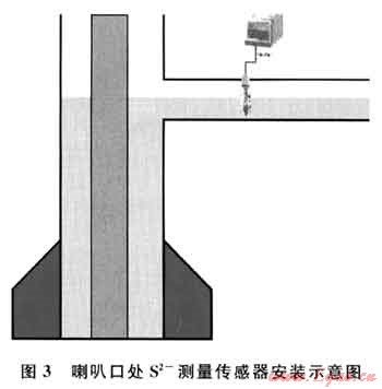 主要存在H2S、HS-、S2-3種形式。鉆井液pH值升高,S2占的比例就相應(yīng)變大,同時如果硫化氫跟強(qiáng)堿相比量很少,主要形成的也是S2-形式,因此初次進(jìn)入井筒的硫化氫主要形成的是S2-形式。在普光氣田鉆井液的pH值一般介于9.5~10.5,故可以通過測量喇叭口處泥漿里的含S2-的情況,結(jié)合大氣環(huán)境的硫化氫監(jiān)測值,對井場硫化氫情況進(jìn)確定,尤其對剛剛進(jìn)入井筒的硫化氫,這種測量克服了目前井場只測大氣中硫化氫的缺點。目前國內(nèi)已有成熟的S2-在線實時監(jiān)測傳感器(圖3)。