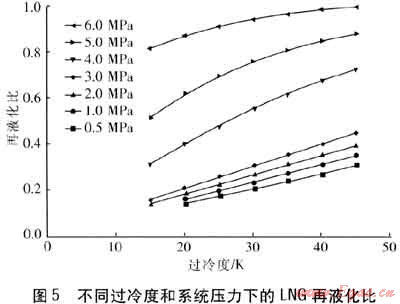 ③ 通過HYSYS軟件模擬,認為LNG再液化工藝是可行的,得出了再液化比與過冷度、系統(tǒng)壓力的關(guān)系,有力地論證了理論分析的合理性。