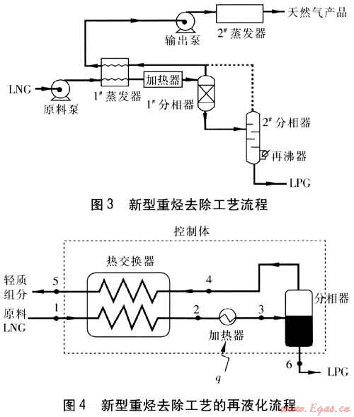 本文提出一種不同于以往的新型重烴去除工藝:將過冷態(tài)LNG的冷能用于凝結(jié)從分相器內(nèi)重組分中蒸餾分離出來的輕質(zhì)LNG組分[1]。目前LNG的冷能利用[2~7]主要有:冷能發(fā)電、空氣分離、冷凍倉庫、液化二氧化碳、熱電循環(huán)等。本文將冷能的應(yīng)用范圍擴大至再液化流程。
