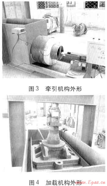 沙箱試驗(yàn)機(jī)由沙箱、加載機(jī)構(gòu)、牽引機(jī)構(gòu)、電氣控制、測(cè)力傳感器、行程開(kāi)關(guān)、計(jì)算機(jī)等部分組成。沙箱試驗(yàn)機(jī)結(jié)構(gòu)見(jiàn)圖2,牽引機(jī)構(gòu)、加載機(jī)構(gòu)外形分別見(jiàn)圖3、4。牽引機(jī)構(gòu)由擺線針輪減速機(jī)、電動(dòng)機(jī)、傳動(dòng)部件等組成,牽引機(jī)構(gòu)通過(guò)測(cè)力傳感器與工作管相連。試驗(yàn)時(shí)牽引機(jī)構(gòu)在行程開(kāi)關(guān)的配合下使工作管作直線往復(fù)運(yùn)動(dòng)(每個(gè)行程100mm),測(cè)力傳感器通過(guò)顯示器顯示推力、拉力。沙箱試驗(yàn)機(jī)可在空載、加載狀況下進(jìn)行操作,在進(jìn)行加載試驗(yàn)時(shí)通過(guò)千斤頂對(duì)試件加載,加載力傳感器通過(guò)顯示器顯示加載力。由計(jì)算機(jī)計(jì)算空載時(shí)平均推(拉)力與加載時(shí)平均推(拉)力的比值。沙箱兩側(cè)焊接20號(hào)槽鋼,并焊接橫梁支撐,便于安裝千斤頂(見(jiàn)圖4)。沙箱底部設(shè)置與牽引機(jī)構(gòu)、電控及儀表箱相連的支座。