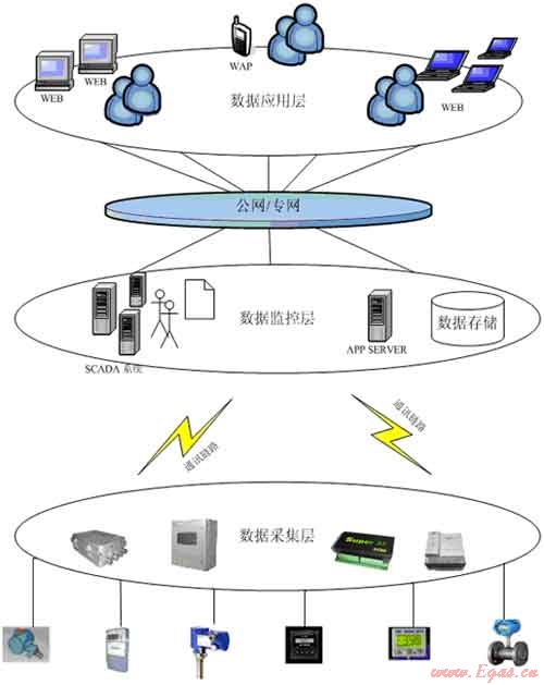 通用SCADA系統(tǒng)可分為3層。第1層為數(shù)據(jù)采集層,由RTU與一次儀表構(gòu)成,完成現(xiàn)場原始數(shù)據(jù)的采集與預(yù)處理。根據(jù)設(shè)計需求還可以實(shí)現(xiàn)現(xiàn)場的數(shù)據(jù)存儲,以保證通訊中斷后數(shù)據(jù)的連續(xù)性;第2層為數(shù)據(jù)監(jiān)控層。在這層將利用各種軟件遠(yuǎn)程仿真現(xiàn)場,實(shí)現(xiàn)數(shù)據(jù)的實(shí)時監(jiān)控、實(shí)時報警。該層可根據(jù)對應(yīng)的管理模式再分為分控中心、總控中心等,還可根據(jù)設(shè)計需求進(jìn)行大量歷史數(shù)據(jù)的存儲;第3層為數(shù)據(jù)應(yīng)用層。在應(yīng)用層實(shí)現(xiàn)對已采集數(shù)據(jù)的分析、整理,并根據(jù)需要實(shí)現(xiàn)多種形式的發(fā)布。業(yè)界很多公司分別在數(shù)據(jù)采集層、數(shù)據(jù)監(jiān)控層、數(shù)據(jù)應(yīng)用層都擁有極其穩(wěn)定的產(chǎn)品和豐富的系統(tǒng)集成經(jīng)驗(yàn)。