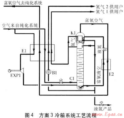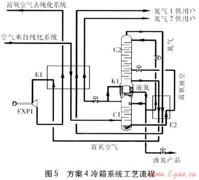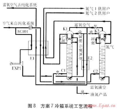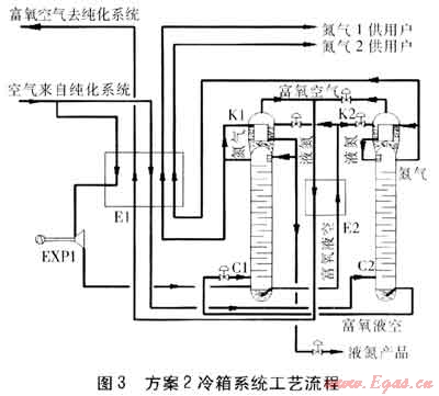 在C1底部產(chǎn)生的富氧液空經(jīng)E2過冷,節(jié)流后進(jìn)入C2進(jìn)行二次精餾,得到產(chǎn)品氮?dú)饨?jīng)E2、E1復(fù)熱后作為氮?dú)?供用戶。得到富氧空氣經(jīng)E2復(fù)熱,進(jìn)入E1被復(fù)熱到約-145℃后,送入EXP1膨脹制冷后,返回E1被復(fù)熱后,送入純化系統(tǒng)。