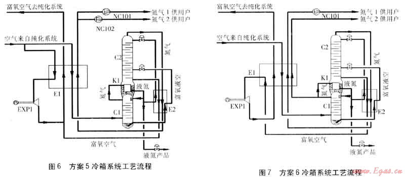 此方案采用兩塔精餾,正流膨脹。主要配置為主換熱器(E1)、精餾塔(C1)、冷凝蒸發(fā)器(K1)、過冷器(E2)、膨脹機(jī)(EXP1)、精餾塔(C2)、冷凝蒸發(fā)器(K2)、空氣增壓機(jī)(AC101)。流程的特點(diǎn)是:氮?dú)?直接由C1抽取并經(jīng)E1復(fù)熱獲得,氮?dú)?直接由C2抽取并經(jīng)E1復(fù)熱獲得。