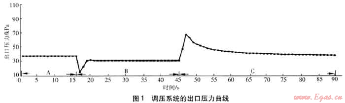 緩沖管道容積的設(shè)置通常有兩種方法:一種是過盈計算方法,需結(jié)合供氣電磁閥的開啟時間、噴火設(shè)備的用氣量、噴火設(shè)備的熄火壓力、調(diào)壓系統(tǒng)的響應(yīng)時間和調(diào)壓器的流量系數(shù)等綜合計算,并考慮一定的管道容積余量。另一種是實驗驗證方法,即在實驗室模擬實際情況來驗證管道容積是否能滿足使用要求。例如:在香港海洋公園大型噴火項目中,已知噴火設(shè)備的最大用氣量為6000m3/h,受場地限制,噴火設(shè)備下游為長30m、公稱直徑為250mm的緩沖管道。為驗證此管道容積是否能滿足使用要求,特進行實驗驗證。通過在上海飛奧燃氣設(shè)備有限公司閥門與調(diào)壓實驗室進行的模擬試驗,得到了調(diào)壓系統(tǒng)的出口壓力曲線,見圖1中的A、B段。