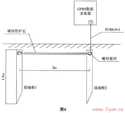 (3) 接地是通過金屬導線與接地裝置連接,將電氣設(shè)備和其他生產(chǎn)設(shè)備上可能產(chǎn)生的漏電流、靜電荷以及雷電電流等引入地下。遠程抄表系統(tǒng)主要有兩種接地,一是防雷接地,二是屏蔽接地。防雷接地是將220V電源浪涌接地、24V電源浪涌接地、信號浪涌接地、流量計表頭感應電接地。屏蔽接地是將RS485信號線屏蔽接地,防止高頻信號或雜波信號干擾影響DTU正常工作。與建筑物共用防雷接地體接地電阻應小于1Ω;單獨使用鍍鋅角鋼打接地樁的接地電阻應小于4Ω。與接地體連接的接地線應使剛6mm2以上的BVR銅芯軟線或銅編織線。單根接地樁接地電阻達不到4Ω的,打接地樁應選擇土層厚實、雜物較少的地方。單獨打一根接地樁無法滿足接地電阻要求,則應再增加接地樁,直至滿足接地電阻要求。相鄰兩根接地樁之間的距離不應小于2m。接地樁之間應使用相同規(guī)格的角鋼焊接或使用6mm2以上的BVR銅芯軟線連接,并用螺絲緊固。其結(jié)構(gòu)如圖4。