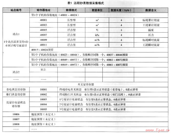 遠程抄表采集的數(shù)據(jù)有兩種類型,一種是計量表具數(shù)據(jù),如流量、壓力、溫度等模擬量數(shù)據(jù);另一種是狀態(tài)信號數(shù)據(jù),如市電狀態(tài)、采集終端柜門狀態(tài)等開關(guān)量數(shù)據(jù)。數(shù)據(jù)采集格式見表1。