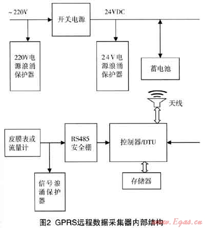 GPRS遠傳數(shù)據(jù)采集器是遠程抄表系統(tǒng)的重要設(shè)備,數(shù)據(jù)采集器具有RS485/232接口,通信速率為300~115200bps,通信協(xié)議采用MODBUS RTU/ASCⅡ工業(yè)通信協(xié)議,內(nèi)部供電一般選擇24VDC。一只數(shù)據(jù)采集終端(DTU)實際應用中一般接1-3只燃氣表。標準GPRS遠程數(shù)據(jù)采集器內(nèi)部結(jié)構(gòu)如下: