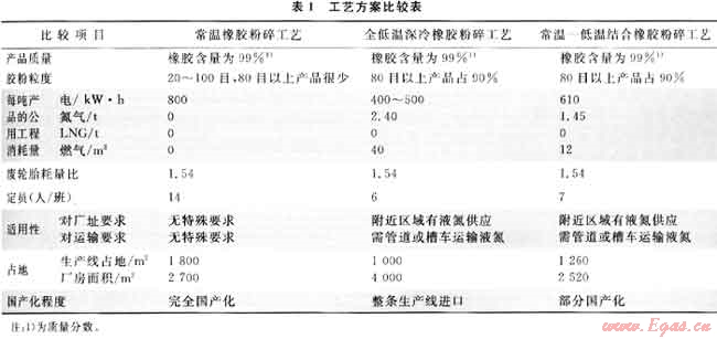 常溫橡膠粉碎工藝、全低溫深冷橡膠粉碎工藝和常溫和低溫相結(jié)合橡膠粉碎工藝的比較見(jiàn)表1[9]。
