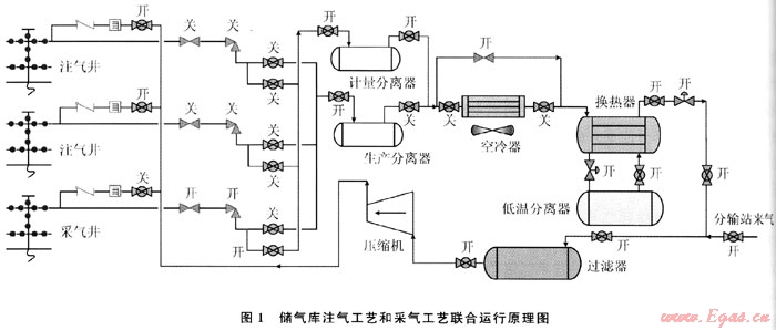 上游天然氣在分輸站調(diào)壓、計量后輸至儲氣庫集注站。進(jìn)站天然氣經(jīng)過濾器除去粉塵和雜質(zhì),經(jīng)壓縮機(jī)組增壓至13.O0~30.OOMPa,冷卻至溫度低于70℃后通過注氣匯管輸至井場注氣閥組,單井計量后再注入儲氣庫氣藏[1]。