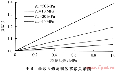 由圖5及式(10)可以看出:氣井無阻流量比值與滑脫系數(shù)(b)呈線性關(guān)系;滑脫系數(shù)(6)越大,供給邊界壓力(pe)越小,參數(shù)δ越大,氣體滑脫對氣井產(chǎn)氣能力影響越大;當(dāng)邊界壓力(pe)較低時(如pe≤5MPa),參數(shù)δ受滑脫系數(shù)(b)影響較大,氣體滑脫效應(yīng)對氣井產(chǎn)氣能力影響較大;而當(dāng)邊界壓力(pe)較大時(如pe≥10MPa),參數(shù)δ受滑脫系數(shù)(b)影響不大,氣體滑脫效應(yīng)對氣井產(chǎn)氣能力影響較小,這一計(jì)算結(jié)果與室內(nèi)巖心滲流實(shí)驗(yàn)結(jié)果一致。