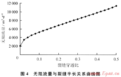 南式(9)的產(chǎn)能公式計(jì)算得到不同裂縫穿透比(Lf/re)對應(yīng)的氣井無阻流量如圖4所示,其中選用的原始儲層壓力為10MPa,即邊界壓力(pe)為10MPa,滑脫系數(shù)(b)為0.6MPa作為產(chǎn)能計(jì)算的參數(shù)值。