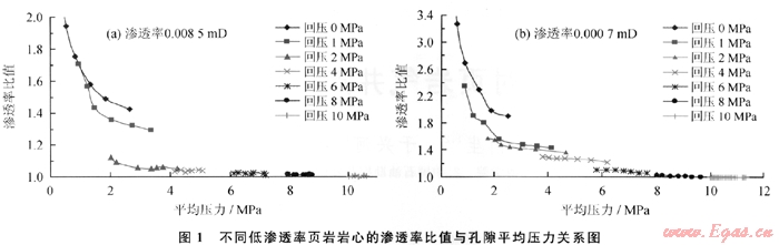 兩塊實(shí)驗(yàn)巖樣取自頁巖氣層,滲透率分別為0.0085mD和0.0007mD。實(shí)驗(yàn)過程中通過增加巖樣出口的回壓來模擬不同儲層孔隙壓力條件下氣體的滲流特征,回壓由初始的0.1MPa逐次增加到1MPa、2MPa、4MPa、6MPa、8MPa和10MPa,實(shí)驗(yàn)過程中計(jì)算并繪制不同回壓狀態(tài)下對應(yīng)的氣體滲流特征曲線 (圖1)??梢钥闯觯涸诘涂紫秹毫?小于1MPa)條件下,氣體在巖樣中的滑脫效應(yīng)顯著;隨著孔隙壓力增加,氣體在巖樣中的滑脫效應(yīng)明顯減弱,當(dāng)孔隙壓力達(dá)到6MPa時,氣體滑脫效應(yīng)引起的滲透率增加值已經(jīng)不足5%;當(dāng)孔隙壓力繼續(xù)增加到8MPa以上時,氣體滑脫效應(yīng)引起的滲透率增加值已經(jīng)小于1%,可見儲層孔隙壓力大小直接決定了氣體滲流過程中滑脫效應(yīng)的強(qiáng)弱,如果儲層孔隙壓力大于1OMPa,那么頁巖氣藏開發(fā)過程中就沒有必要考慮滑脫效應(yīng)對于氣井產(chǎn)能和生產(chǎn)壓力的影響。換算到地層條件下就是如果氣藏壓力系數(shù)等于1,那么深度大于1000m的氣藏開發(fā)就可以不必考慮滑脫效應(yīng)的影響;如果氣藏壓力系數(shù)等于0.5,那么深度大于2000m的氣藏開發(fā)就不受滑脫效應(yīng)的影響,但是對于1000m的氣藏,滑脫效應(yīng)對于氣藏的開發(fā)效果有一定的影響,這種影響對于產(chǎn)能極低的頁巖氣藏來講是不可忽視的。
