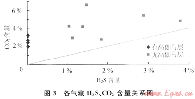 硫酸鹽熱化學(xué)還原反應(yīng)的一個(gè)重要特征就是隨天然氣中H2S含量增高,CO2的含量也相應(yīng)增高,且C02的含量高于H2S含量[7~8]。這一反應(yīng)要產(chǎn)生H2S或HS-,這些產(chǎn)物溶于水變成為氫硫酸,氫硫酸在碳酸鹽巖儲(chǔ)層中與巖石孔壁反應(yīng)產(chǎn)生溶蝕作用,造成儲(chǔ)層溶蝕孔洞發(fā)育,釋放的C02造成天然氣中C02含量高于H2S含量。該區(qū)各氣藏正好具有C02含量高于H2S含量的特征(圖3)。另外,在高H2S含量的Sam-53-1井巖心觀察和薄片分析表明,儲(chǔ)層內(nèi)溶蝕孔洞發(fā)育,而H2S含量低的構(gòu)造內(nèi),溶蝕孔洞不發(fā)育,這些均說明該區(qū)H2S的確為硫酸鹽熱化學(xué)還原反應(yīng)產(chǎn)生。
