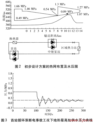 按靜態(tài)水力分析,初步設(shè)計方案是合理的,最大壓力在首站處(壓力為1.66MPa),外部管網(wǎng)靜態(tài)運(yùn)行壓力小于1.6MPa。動態(tài)水力分析顯示,初步設(shè)計方案的設(shè)計、運(yùn)行易由于壓力的大幅度波動產(chǎn)生超壓或汽化,導(dǎo)致嚴(yán)重的安全問題。為提高輸送干線的安全性,需對初步設(shè)計方案進(jìn)行改進(jìn):提高設(shè)計壓力,取消中繼泵站,系統(tǒng)最大壓力為2.5MPa;在首站處供水溫度提高為135℃,回水溫度不變,供回水溫差加大5℃,流量減小8%;首站循環(huán)泵采用兩級泵形式,保證控制的穩(wěn)定性。改進(jìn)設(shè)計方案的熱網(wǎng)布置及水壓圖見圖5。