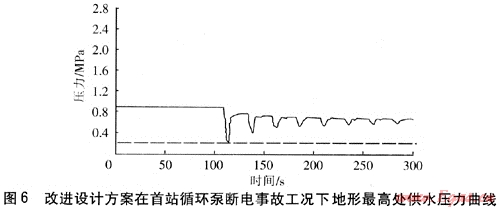 由圖6可知,在首站循環(huán)泵斷電事故工況下,地形最高處的供水壓力高于飽和蒸汽壓力,供熱介質(zhì)不會發(fā)生汽化。動態(tài)水力分析表明,以較高的供水溫度減小供熱介質(zhì)流量,以及提高壓力水平,可以在系統(tǒng)出現(xiàn)事故工況時,保證供熱系統(tǒng)安全運(yùn)行。
