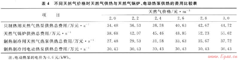 設(shè)天然氣鍋爐熱效率為85%,初投資約為40萬元。設(shè)備折舊費用按設(shè)備費的10年平均折舊計算,維修與管理費用按設(shè)備折舊費的20%計。天然氣鍋爐的效率比天然氣熱泵的供熱效率低,而且只有供熱的功能。在供熱量相同和天然氣價格不同時,只用于供熱的天然氣熱泵與天然氣鍋爐供熱費用的比較見表4。由表4可以看出,天然氣鍋爐供熱的總費用比天然氣熱泵單供熱的費用高,天然氣價格越高,二者之差越大,說明天然氣熱泵的效益更顯著。